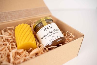 Our Small Gift Box with Hessian Ribbon comprises of a jar of our Multifloral Raw Honey (250g) in a glass jar with gold tamper. Included also is a cyclinder swirl pure beeswax candle.